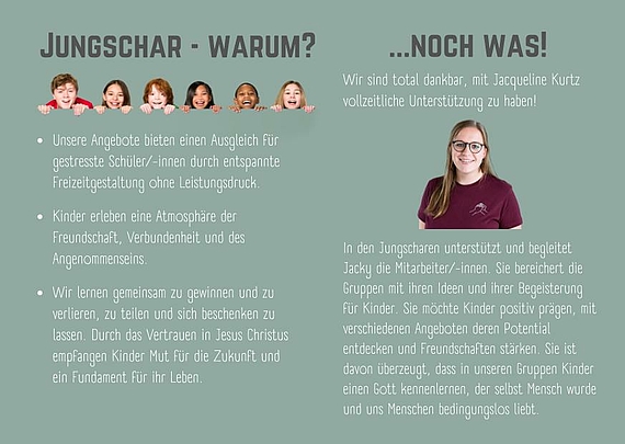 Jungschar ist etwas Besonderes. Hier können Kinder Gott kennenlernen. Hier gibt es kein Training und keinen Erfolgsdruck. Einfach ankommen und mitmachen!
